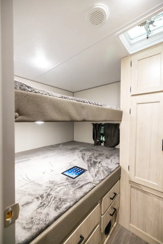 Spacious 36-foot bunkhouse trailer designed for family adventures. Three queen beds provide room for everyone. Durable construction, large fresh and gray water tanks, and a 21-foot awning make it perfect for road trips or back-country getaways.