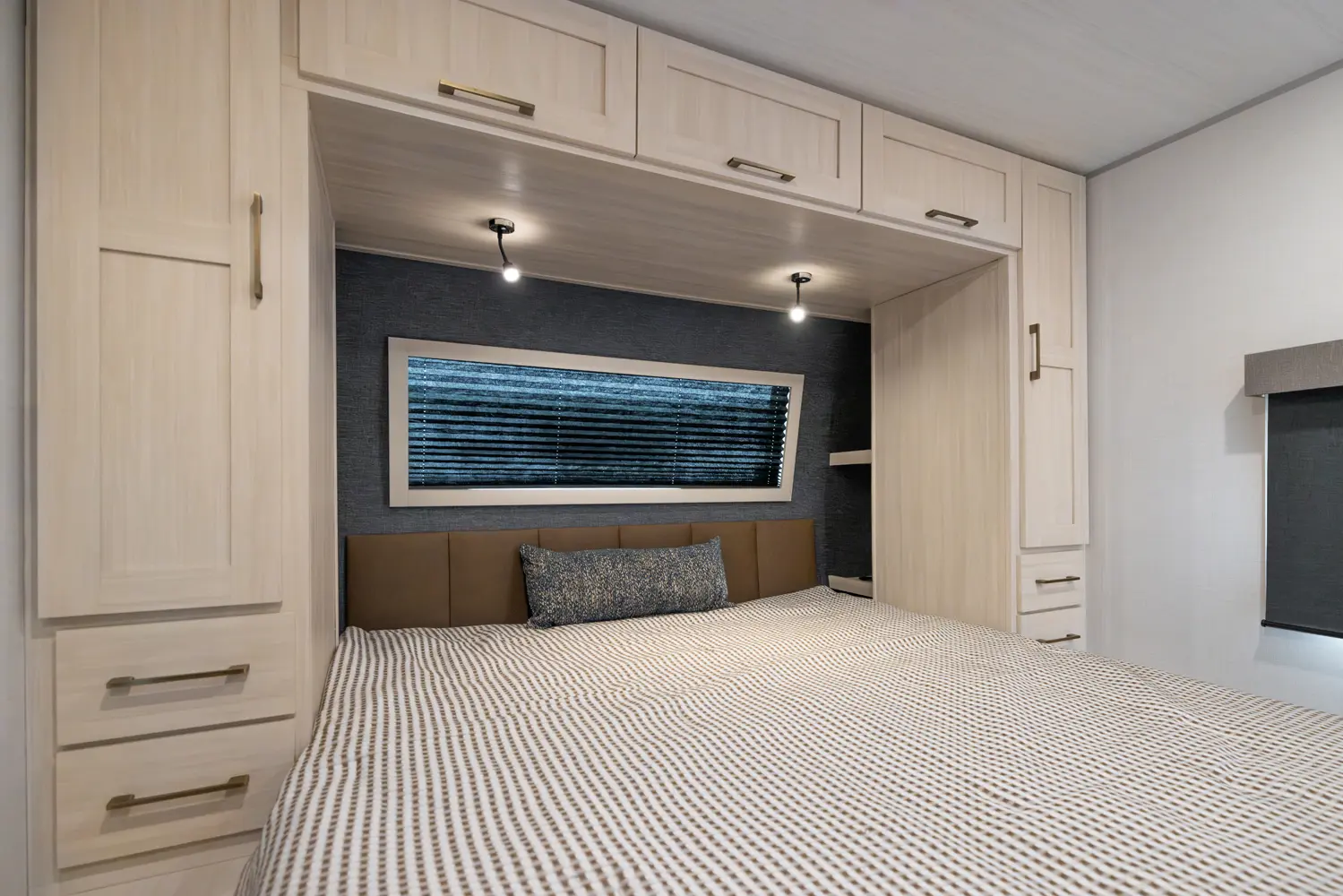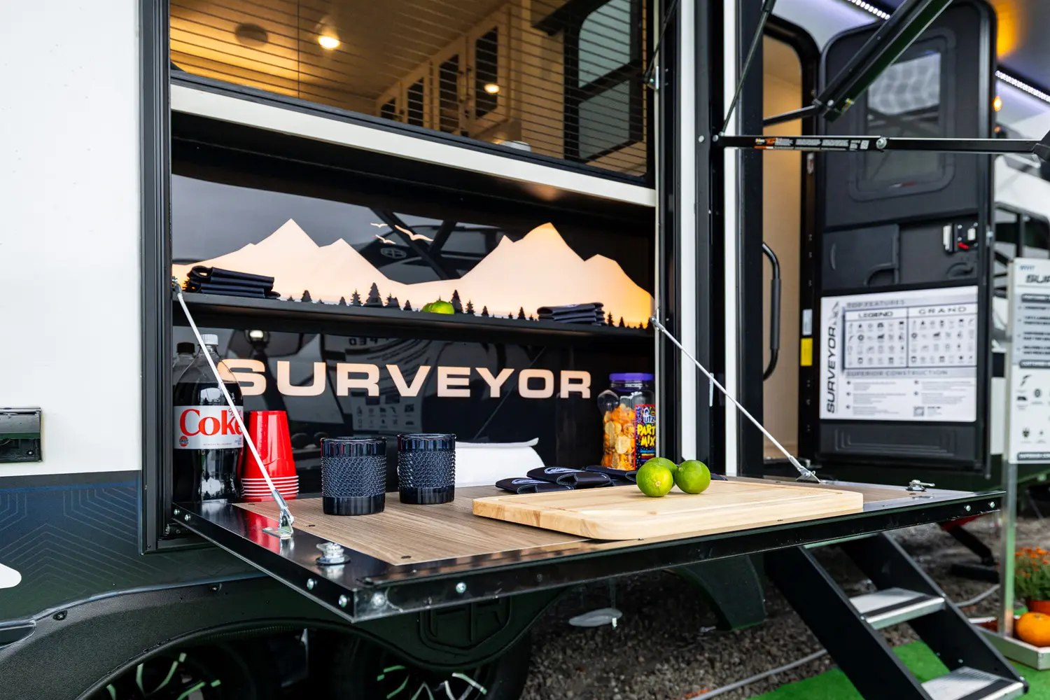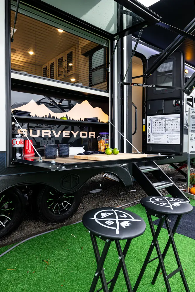 This 36' 7" travel trailer offers a spacious rear living area with dual opposing slides, creating an open, inviting space. The modern kitchen is equipped with a 10 cu. ft. 12V black glass refrigerator and a 3-burner residential-style range with glass cover. The custom king bedroom suite features ample storage, motion lighting, and a privacy wall. Exterior features include a 12' electric awning with LED lights, outdoor camp kitchen, TrailGate outdoor bar, and a hot & cold spray port.