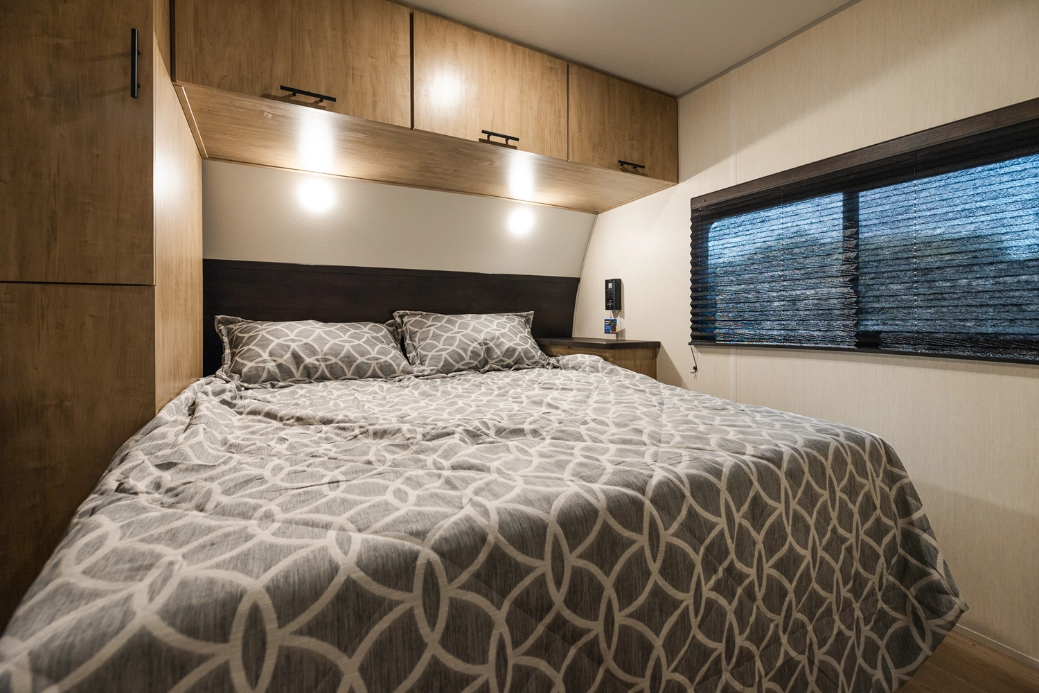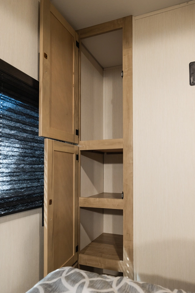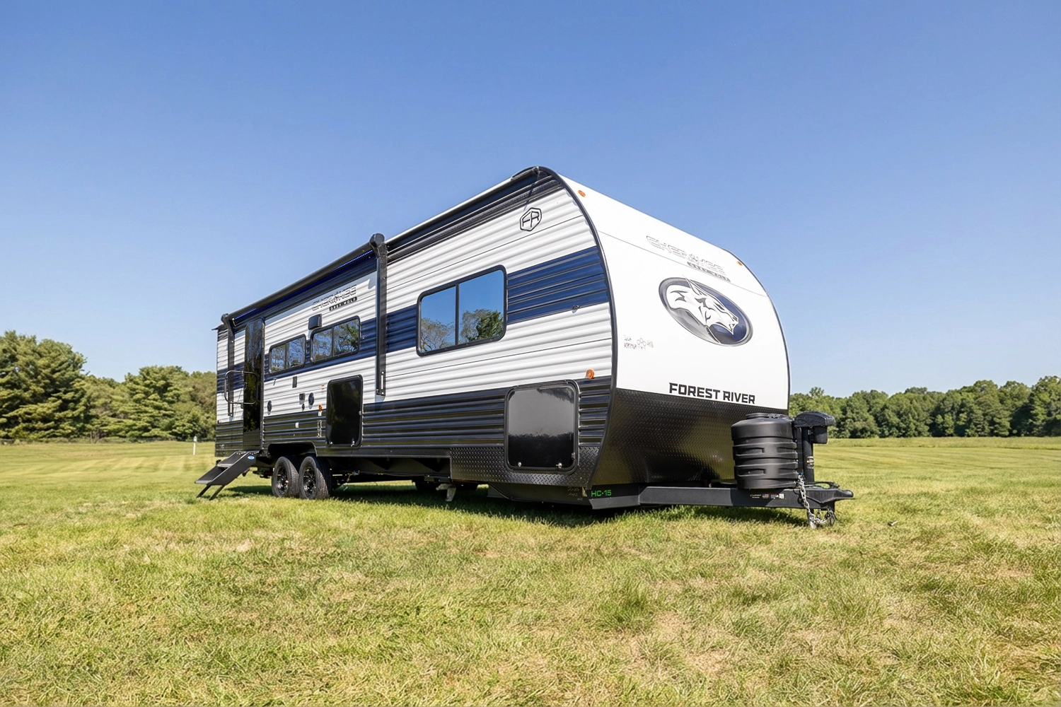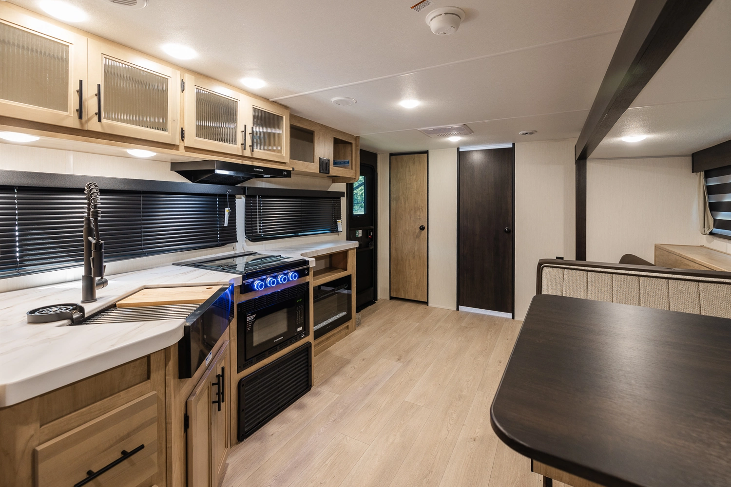The Cherokee Grey Wolf 26LK by Forest River offers a spacious and luxurious layout in a compact 32-foot package. The living room and full bathroom provide comfort and convenience, while the rear bedroom, featuring a king-size bed and ample wardrobe space, offers a peaceful retreat. The well-equipped kitchen, with a large 12-volt refrigerator, air fryer combo microwave, and utility sink, is perfect for cooking and entertaining. Experience the comfort and style of the Cherokee Grey Wolf 26LK!
