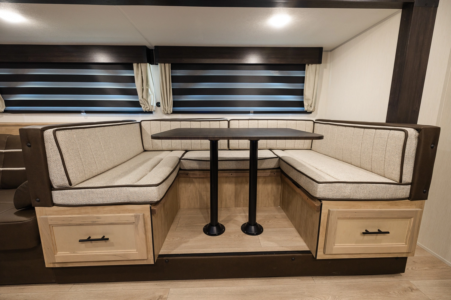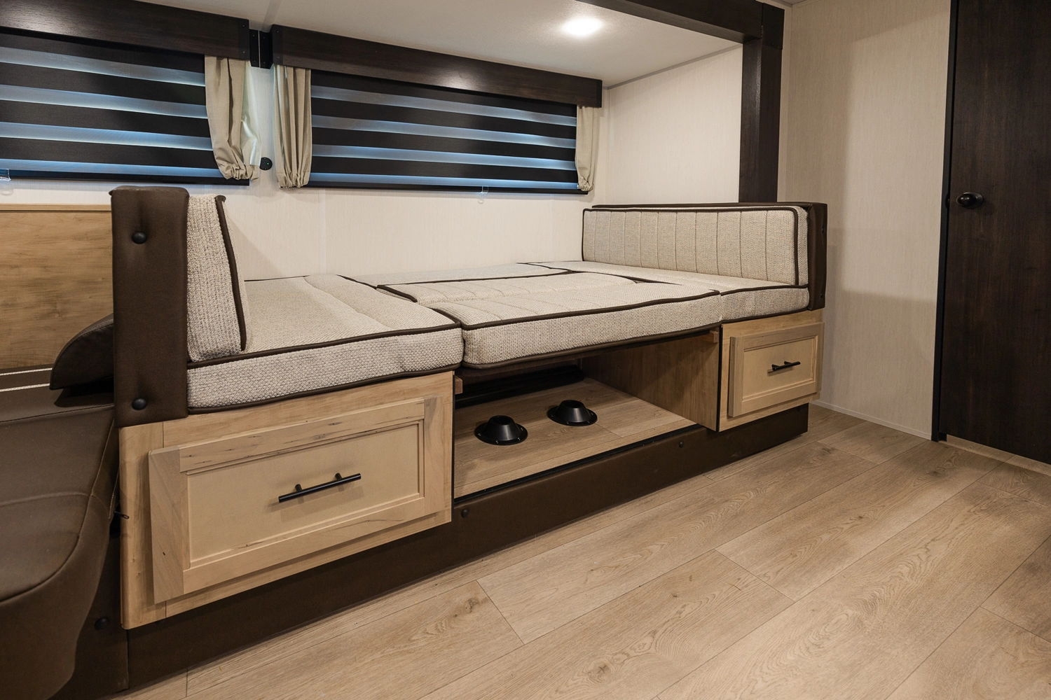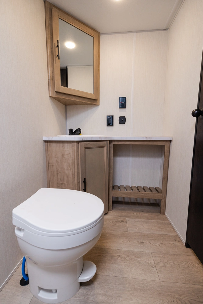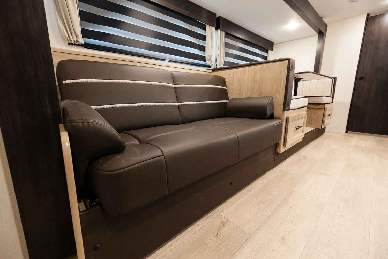 The Cherokee Grey Wolf 26LK by Forest River offers a spacious and luxurious layout in a compact 32-foot package. The living room and full bathroom provide comfort and convenience, while the rear bedroom, featuring a king-size bed and ample wardrobe space, offers a peaceful retreat. The well-equipped kitchen, with a large 12-volt refrigerator, air fryer combo microwave, and utility sink, is perfect for cooking and entertaining. Experience the comfort and style of the Cherokee Grey Wolf 26LK!