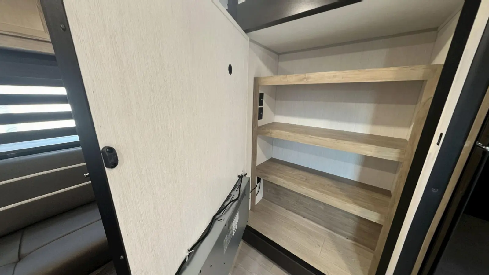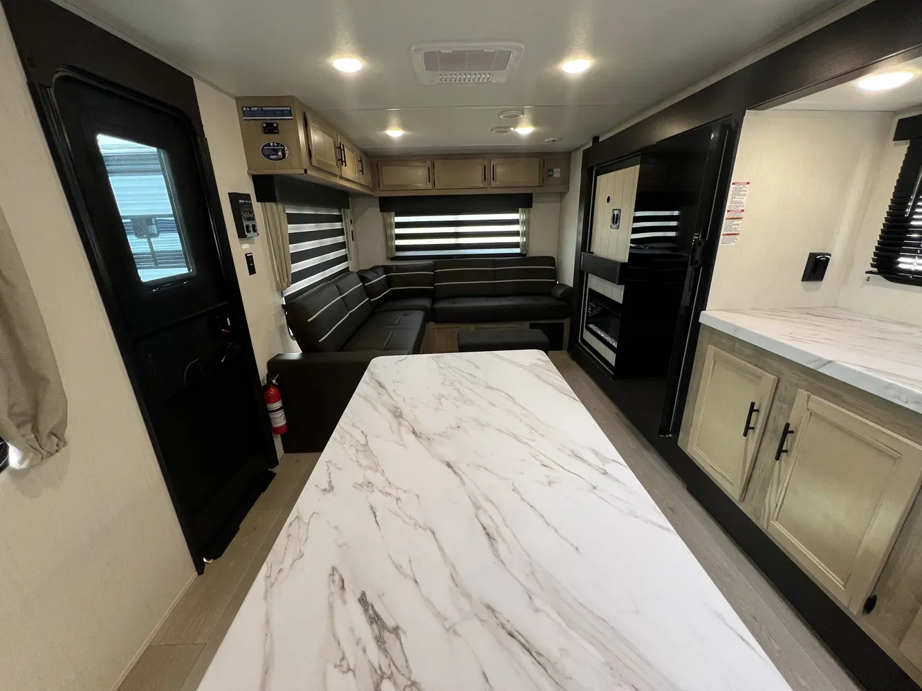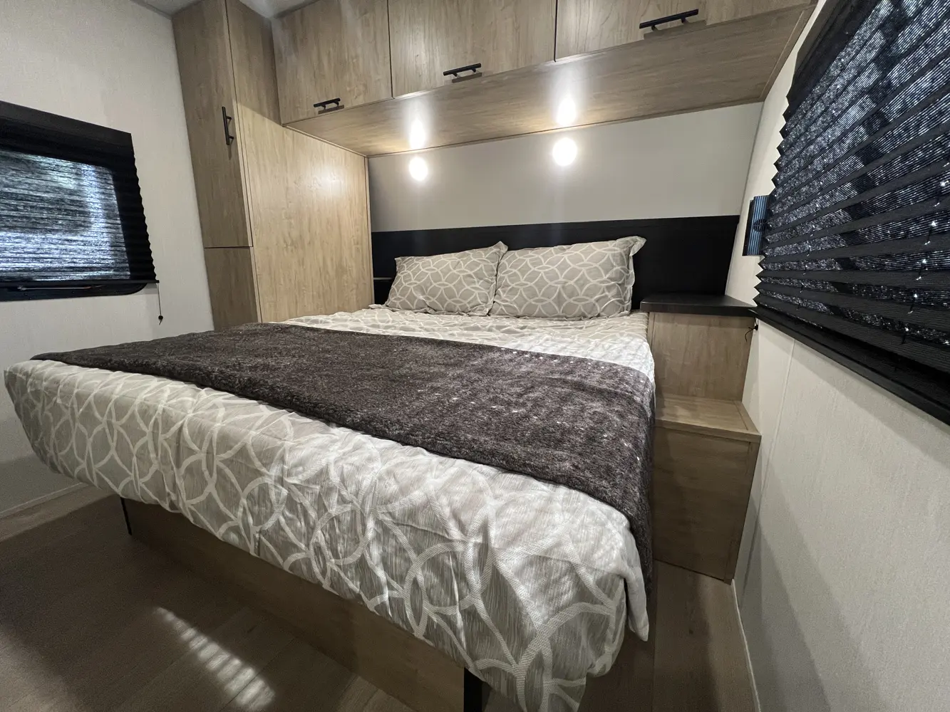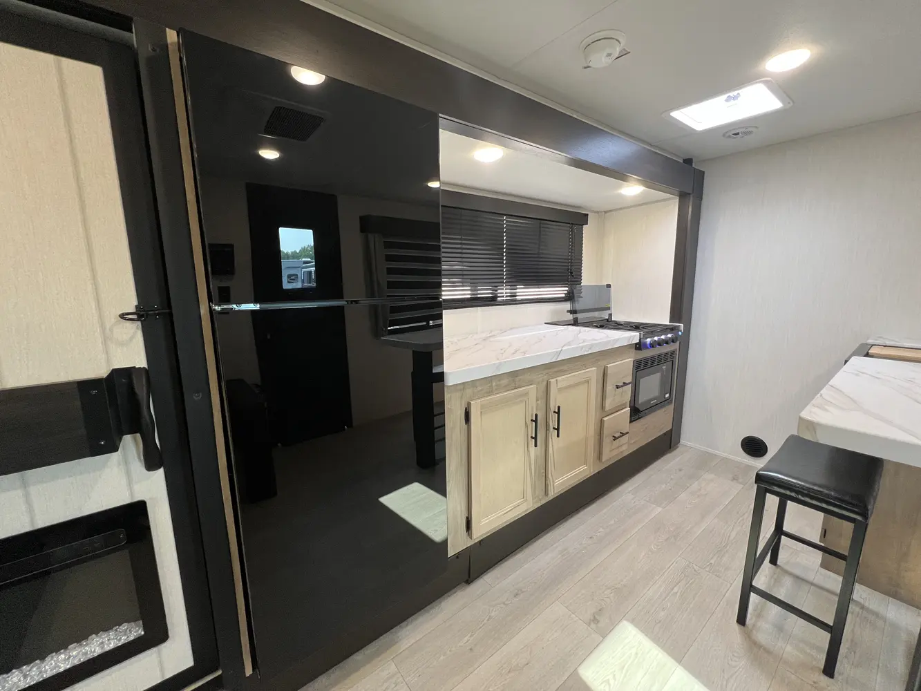 The Cherokee Grey Wolf 27LH by Forest River is a stylish and functional travel trailer with a focus on affordability, perfect for modern camping. Despite its compact 33-foot, 6-inch length, the 27LH feels incredibly spacious, thanks to its residential-style sofa and large windows that flood the interior with natural light. The bedroom is also impressive with a king size bed and plenty of wardrobe space.