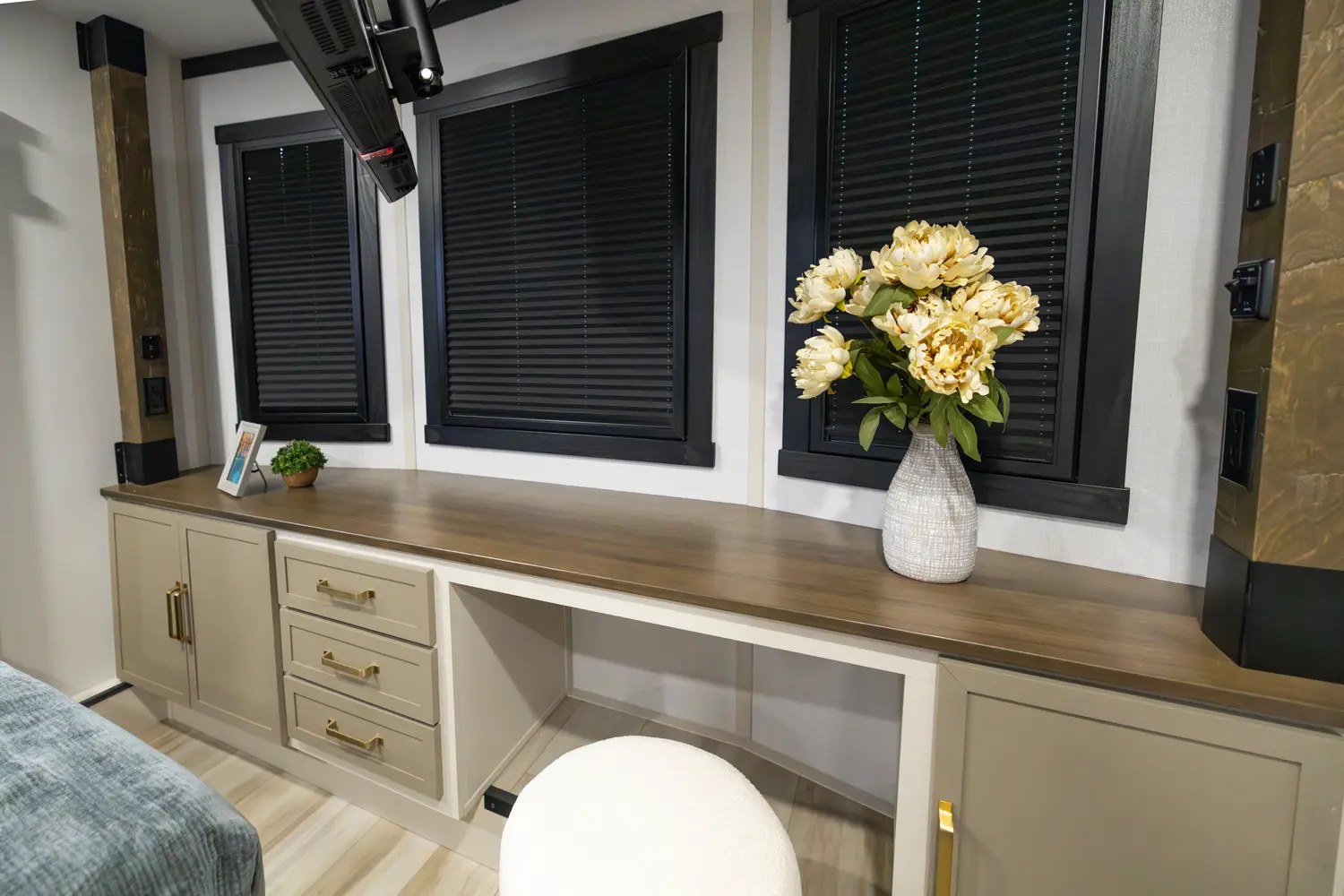 The ROOST43 provides a new segment to the RV market with a combination of a destination trailer in fifth wheel form. This creates the opportunity to move from locations easier than bumper pulling and provides the most square footage in this segment of RVs (530 Sq.Ft. compared to 399 Sq.Ft.). The ROOST43 is feature packed with residential style kitchen appliances, HUGE rear den, two lofts, bath and a half, laundry room, and an elegant interior design. The ROOST43 is will set a new era for RVing.