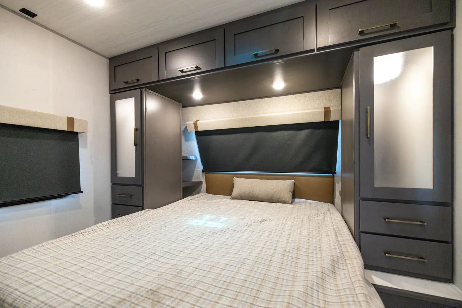 The 26BRE features an innovative layout with a front queen bedroom with dual wardrobes, and provides ample storage space. The central kitchen includes modern appliances, including a large refrigerator and air fryer microwave, while the Bar 2 Table feature converts from a bar into a four-person dining table. The 26BRE includes an enclosed underbelly with forced heat, radiant foil insulation, and 12V heating pads on all tanks. Complete with a 20' power awning and rugged construction.
