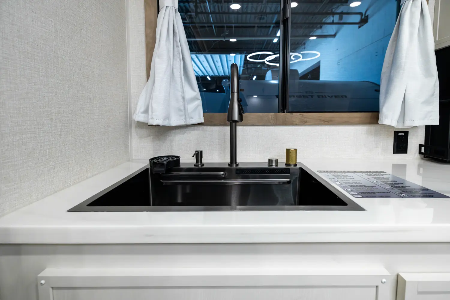 • Deep Single Bowl Task Sink Including High-Rise Pull-Down Faucet Sprayer, Waterfall Faucet, Glass Washer, Soap Dispenser, Countertop Strainer Control, Colander, Task Basket, Cutting Board