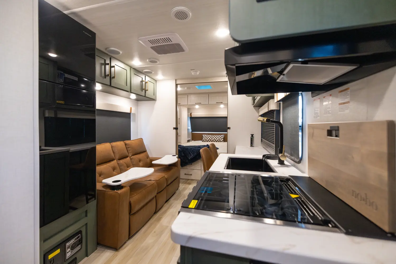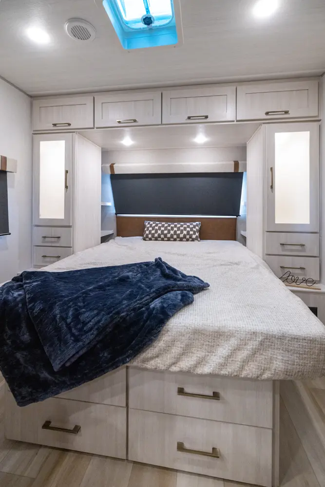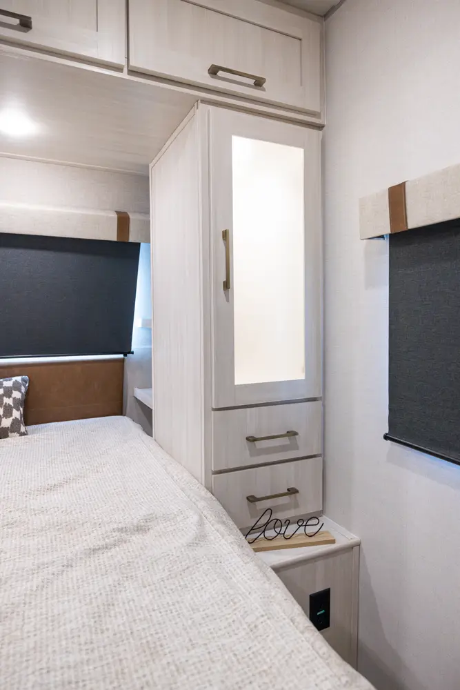 Compact yet full-featured, this travel trailer offers a private queen bed with overhead storage, a spacious kitchen with large fridge and air fryer microwave, full bath with high-powered fan, and walk-in pantry. Built for four-season camping with heated enclosed underbelly, radiant foil insulation, and 12V tank pads. A 16' power awning expands your outdoor living space.