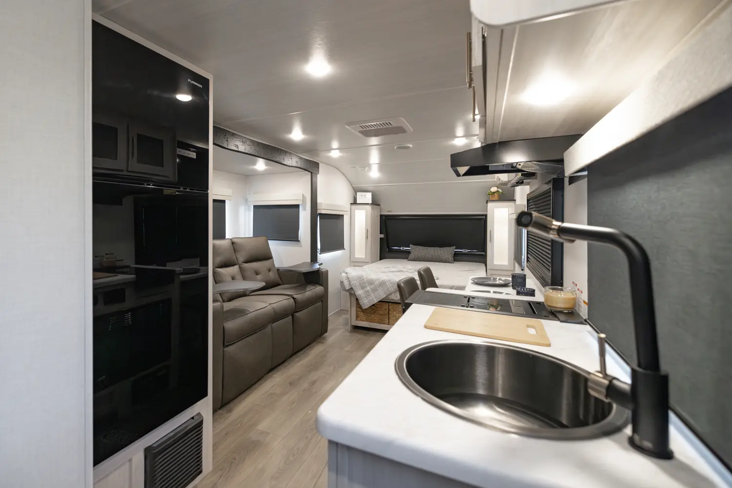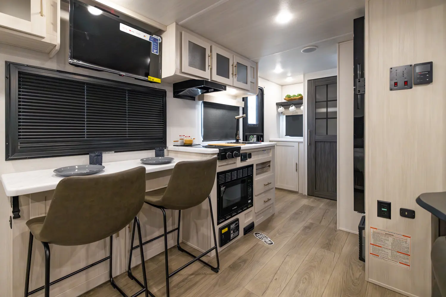 The RP-206 combines comfort and functionality in a smart, modern layout. A front queen bed offers restful sleep, while the rear full bathroom and full-size pantry add convenience and storage on the road. The kitchen is well-equipped with a bar top and flip-up window, convection microwave, and 12V refrigerator, making meal prep easy. Inside, theater seating provides a comfortable living space. Outside, enjoy a 13' power awning and hot & cold spray port—ideal for compact adventures.