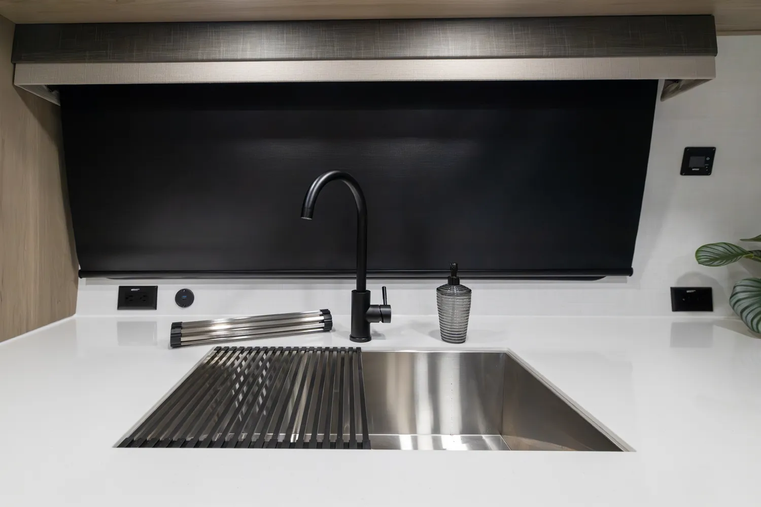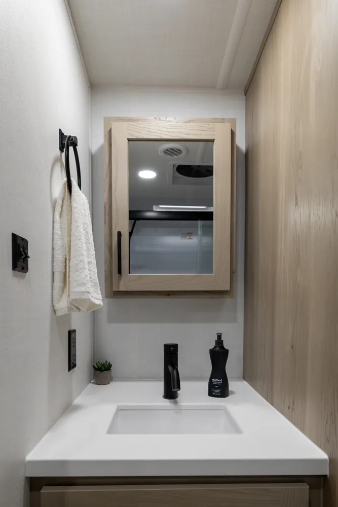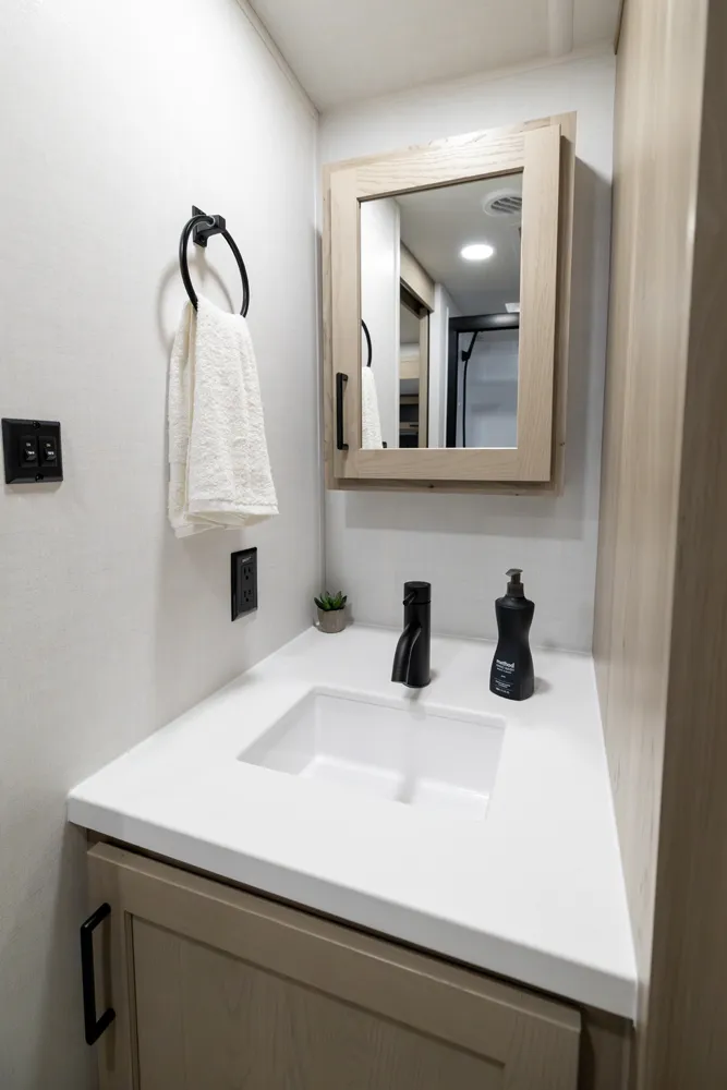 The front kitchen with a large window creates an open, inviting feel with great campsite views. Theater seating faces the entertainment center for easy viewing, with an optional hide-a-bed for guests. The bedroom includes a queen bed in a slide-out, dresser, and wardrobe with washer/dryer prep. A spacious bathroom with a large shower and linen storage adds comfort and convenience, making this coach feel like home.