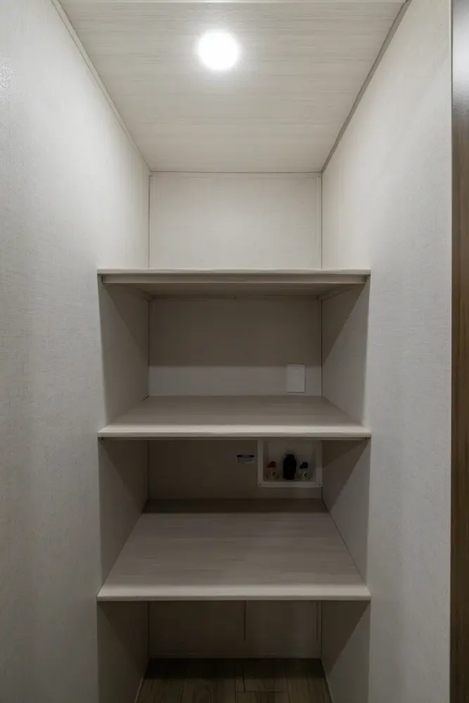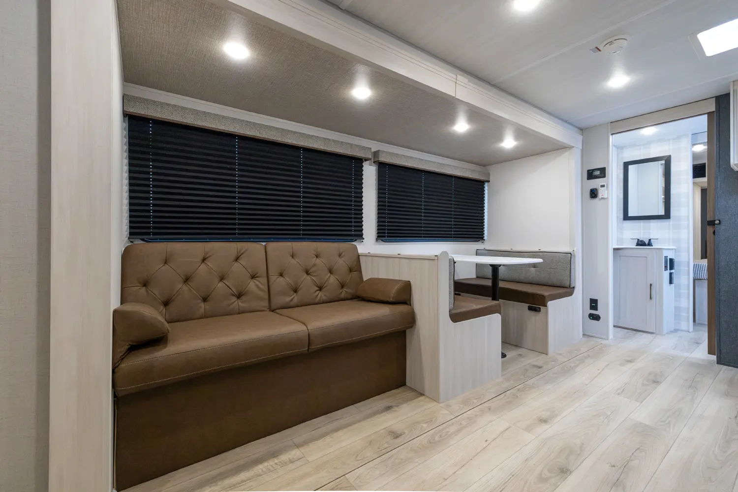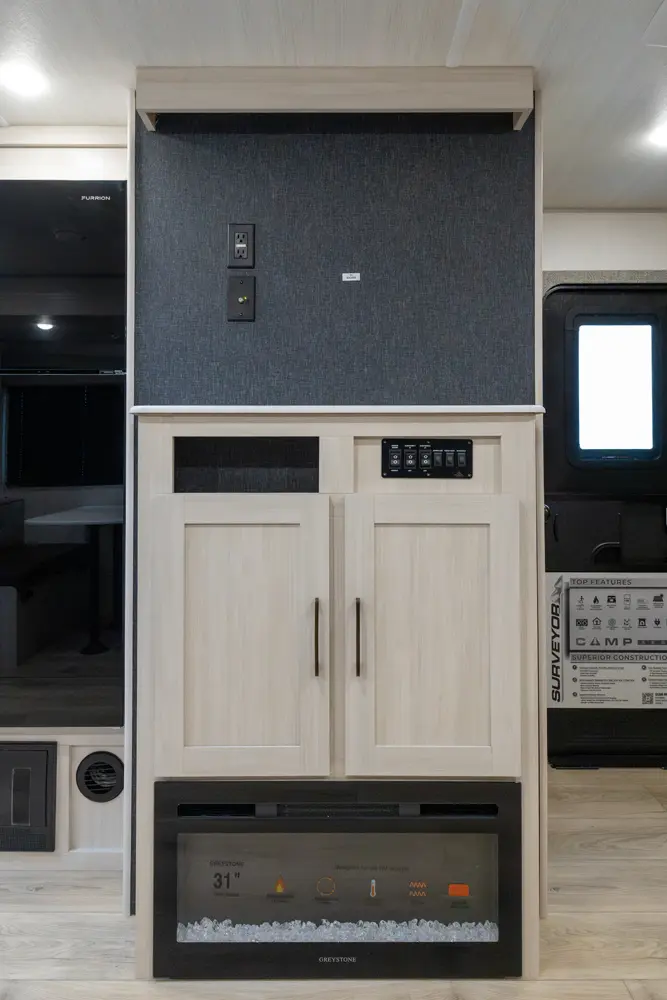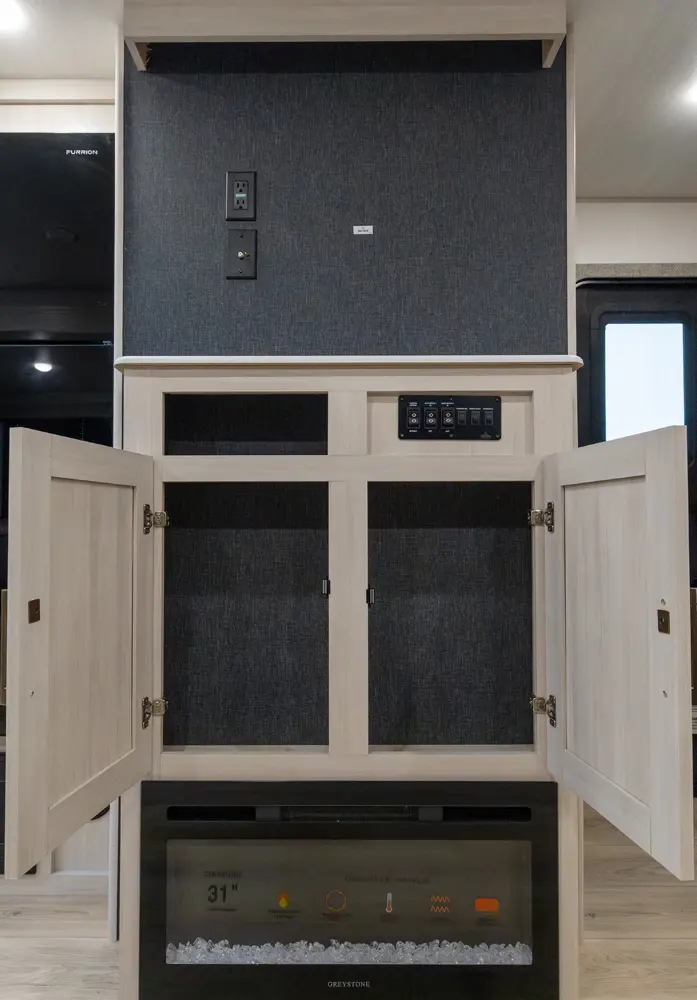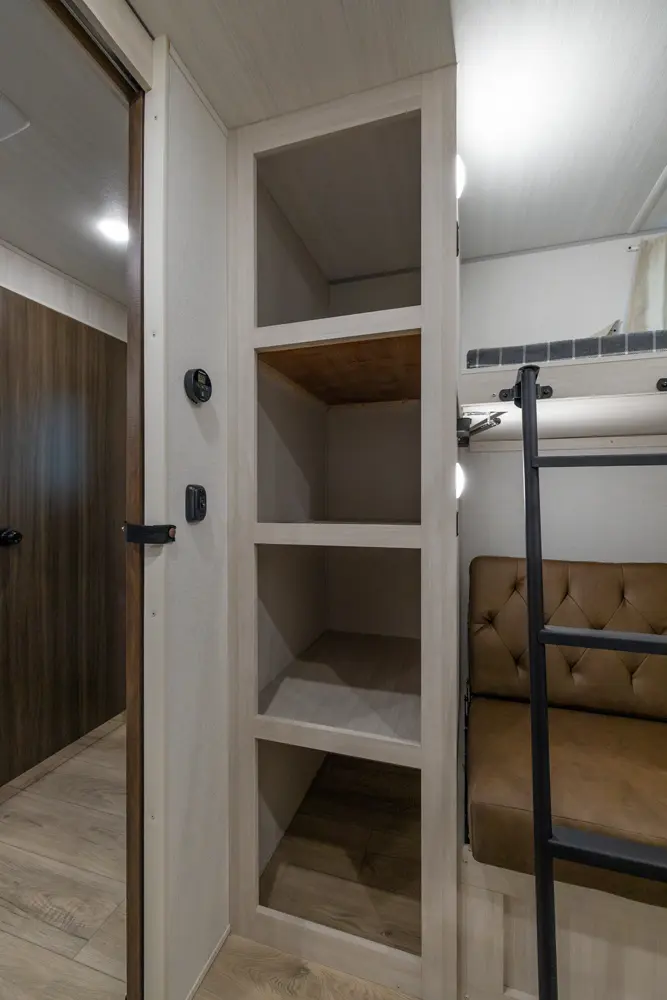 This 37' 11" travel trailer features a front private bedroom with a queen bed and ample storage. The rear private bunkhouse offers two full-size bunks and a wardrobe. The kitchen includes a 10 cu. ft. 12V refrigerator, oven, and stovetop. Living space includes a sofa and booth dinette. Exterior amenities include a 21' electric awning, outdoor camp kitchen, and a hot & cold spray port.