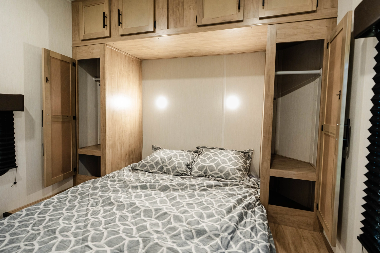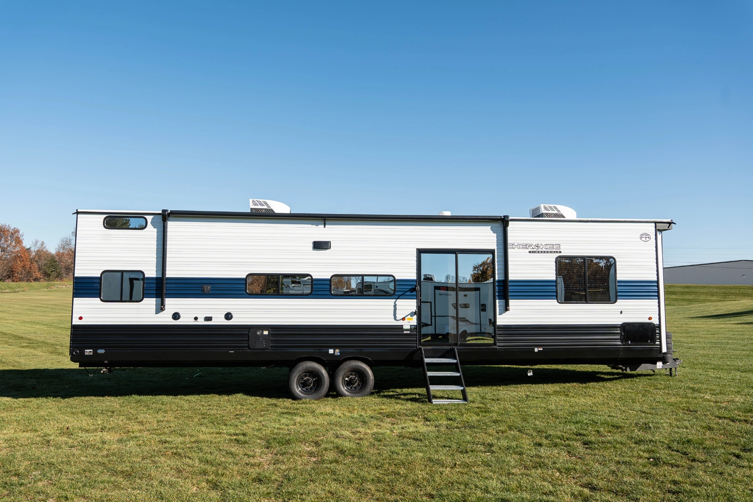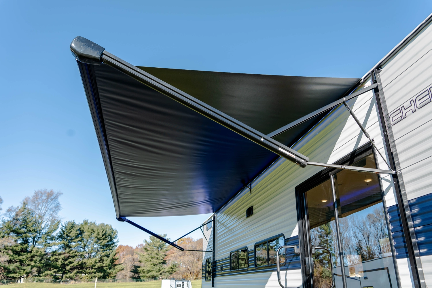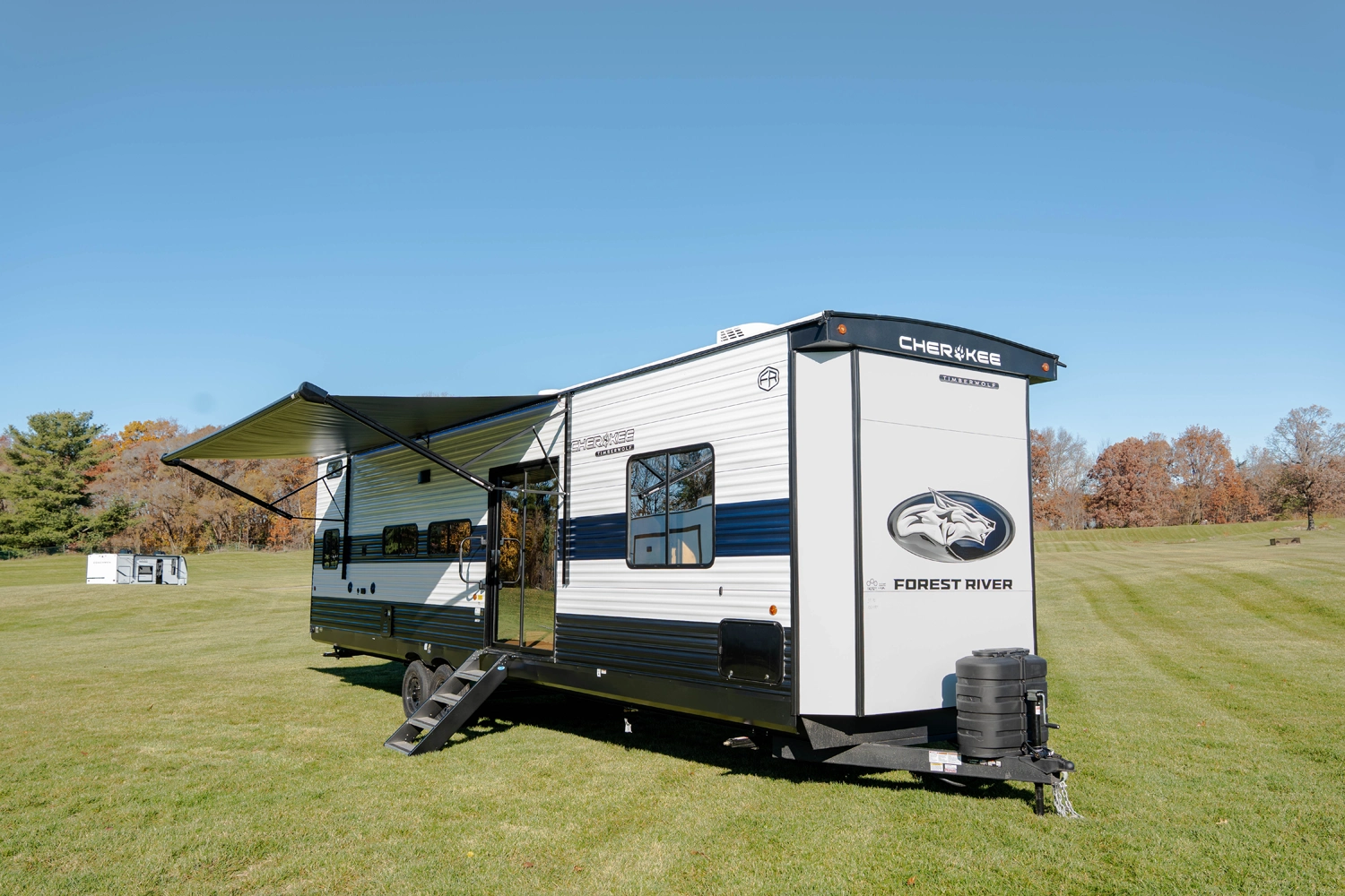• Cherokee Black Label Timberwolf (Deep Tinted Frameless Automotive Glass Windows, High Gloss Gel Coat Exterior Sidewalls, Multicolor Reading Lights, Pillowtop Mattress Upgrade, Thermo Foil Arctic Insulation, Wall Controlled Power Shades for Living Room and Kitchen)
