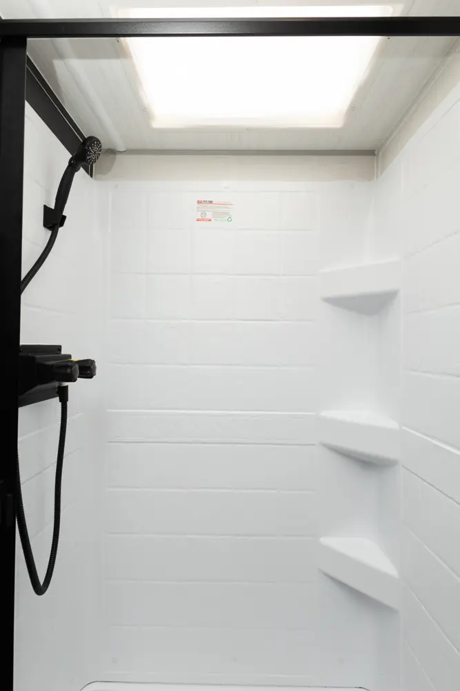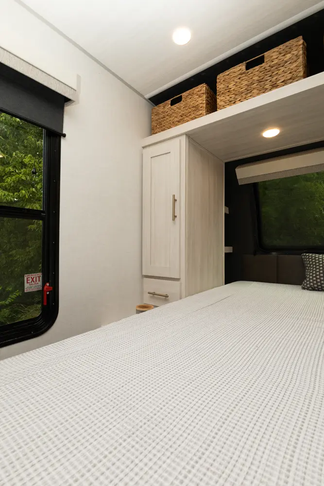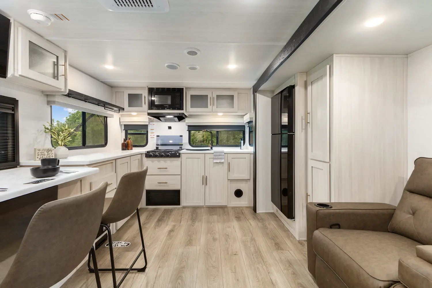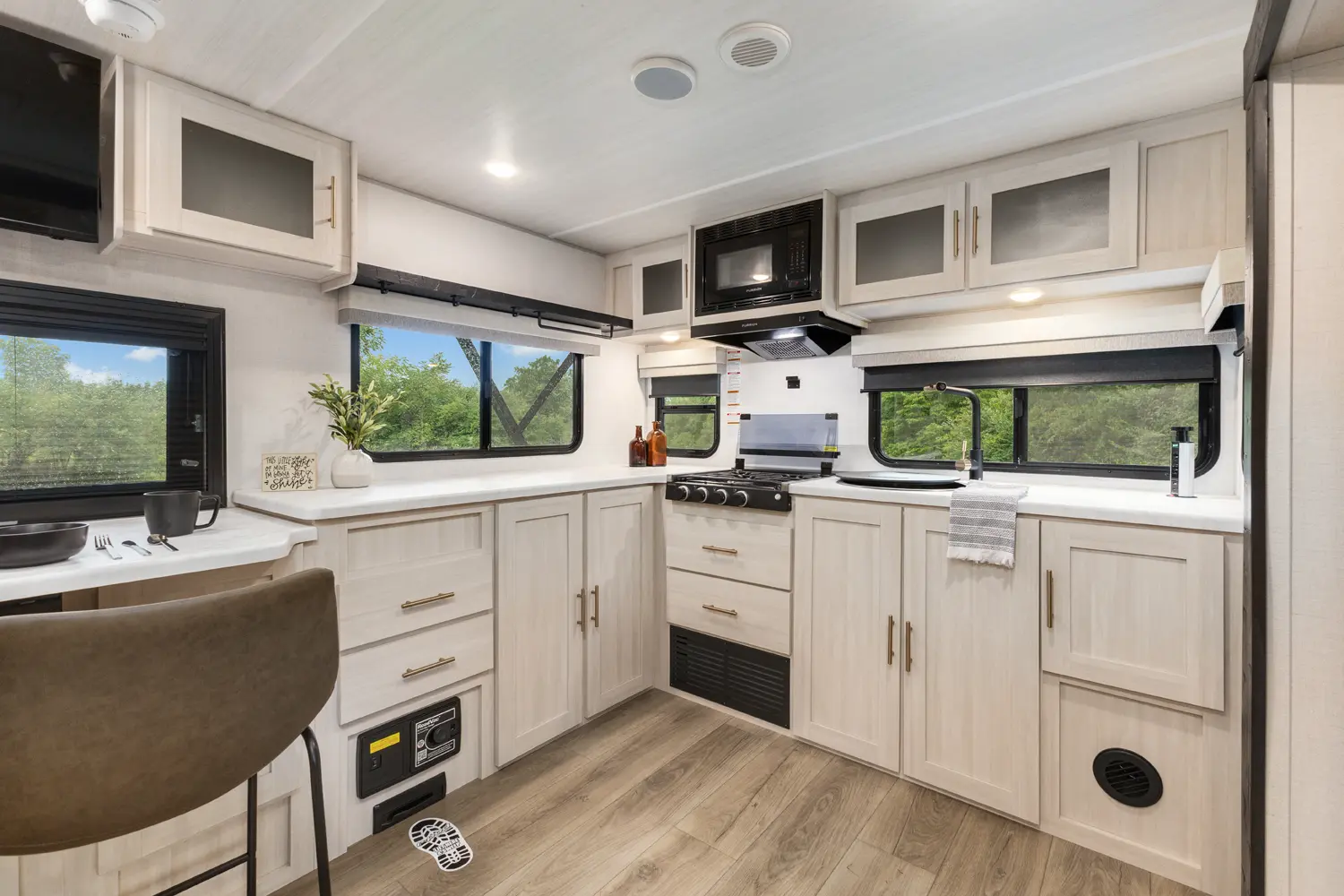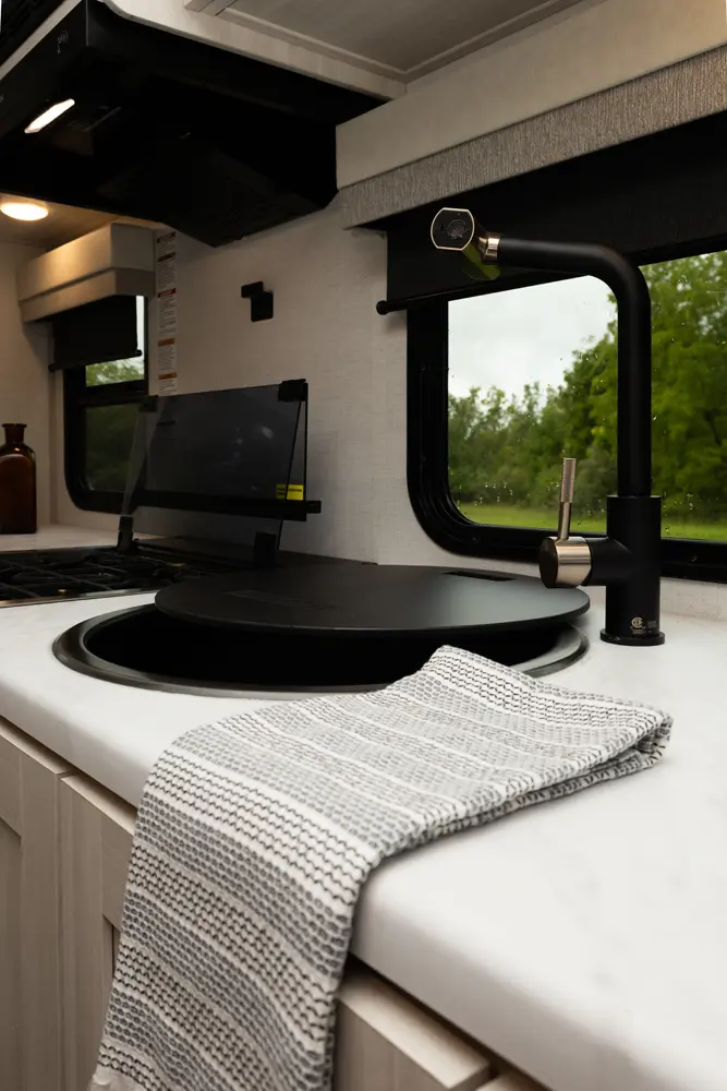 The Un•Mapped 24RK features a rear kitchen layout with a 12V black glass refrigerator, and an air fryer microwave. The Bar2Table pull-out dinette and TrailGate outdoor bar enhance dining flexibility and outdoor entertaining. Inside, enjoy a king bed, 15K A/C, and a tankless on-demand water heater. Exterior amenities include a 21' powered awning and a hot & cold spray port.