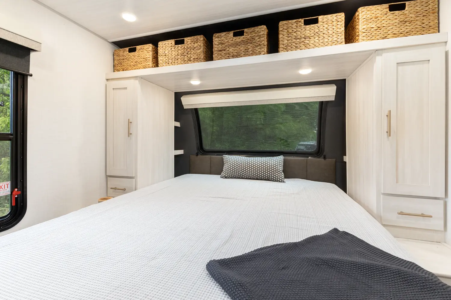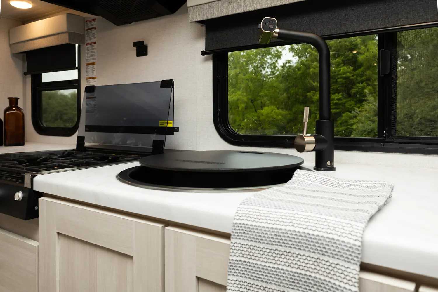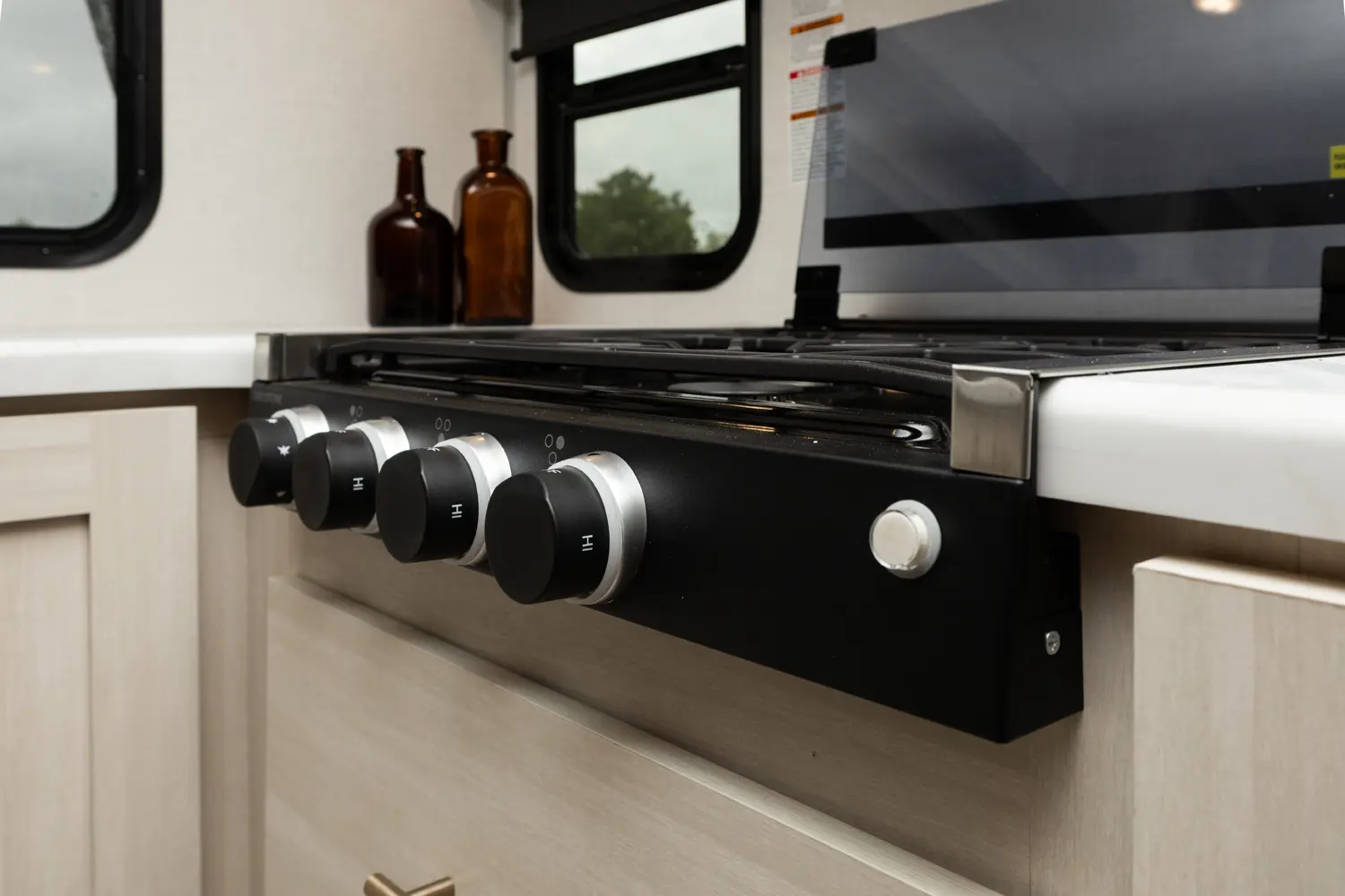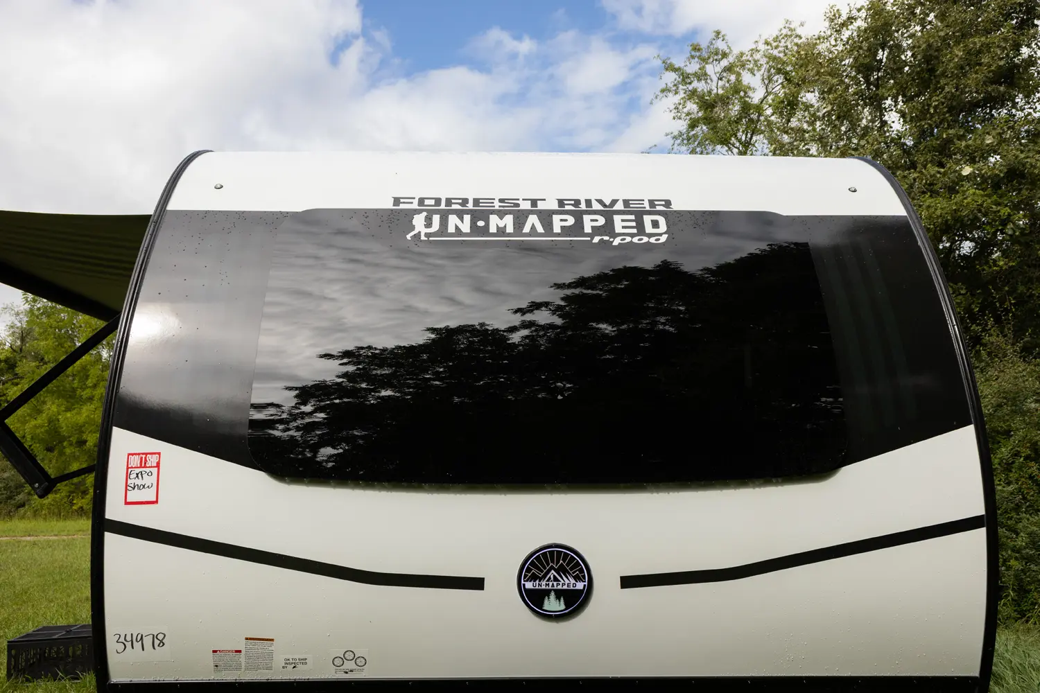 The Un•Mapped 24RK features a rear kitchen layout with a 12V black glass refrigerator, and an air fryer microwave. The Bar2Table pull-out dinette and TrailGate outdoor bar enhance dining flexibility and outdoor entertaining. Inside, enjoy a king bed, 15K A/C, and a tankless on-demand water heater. Exterior amenities include a 21' powered awning and a hot & cold spray port.