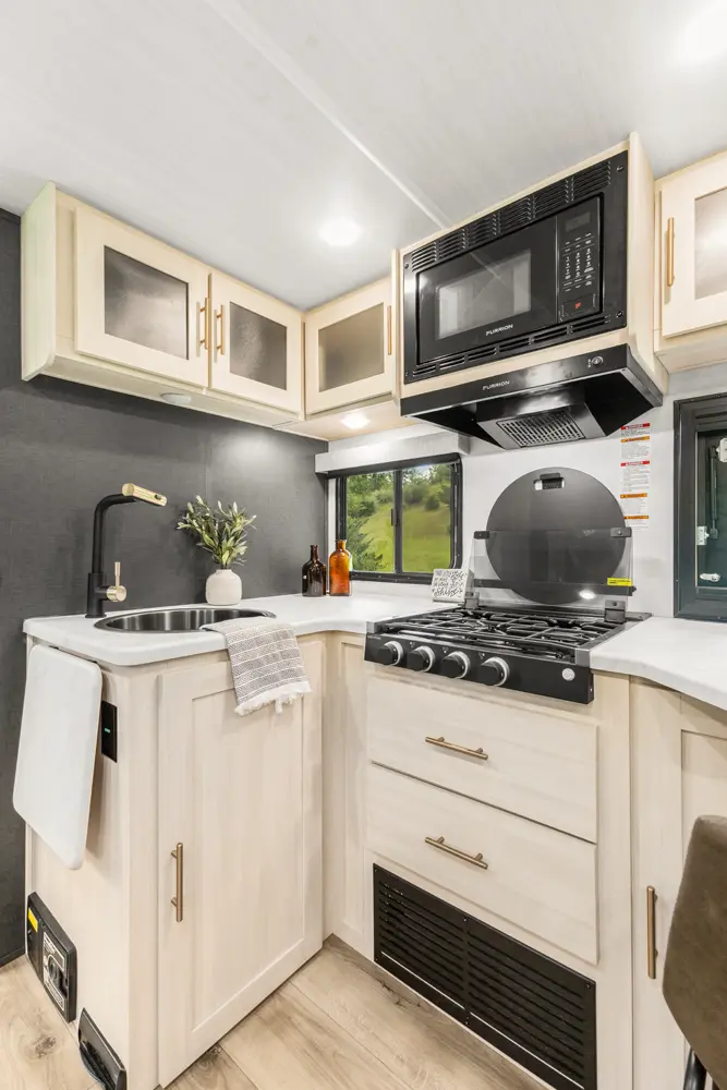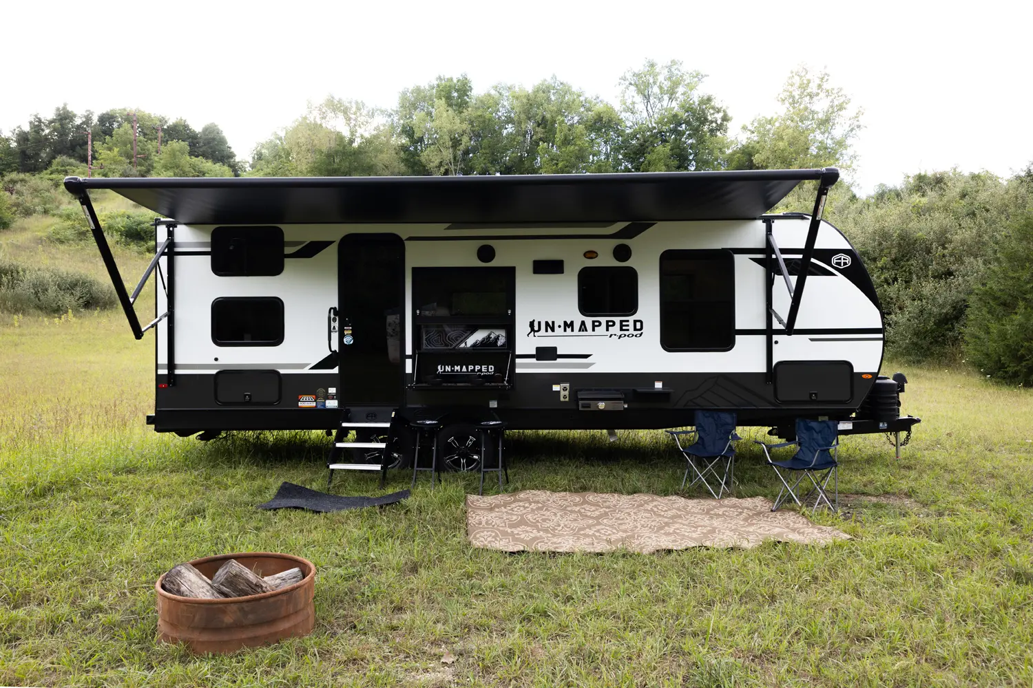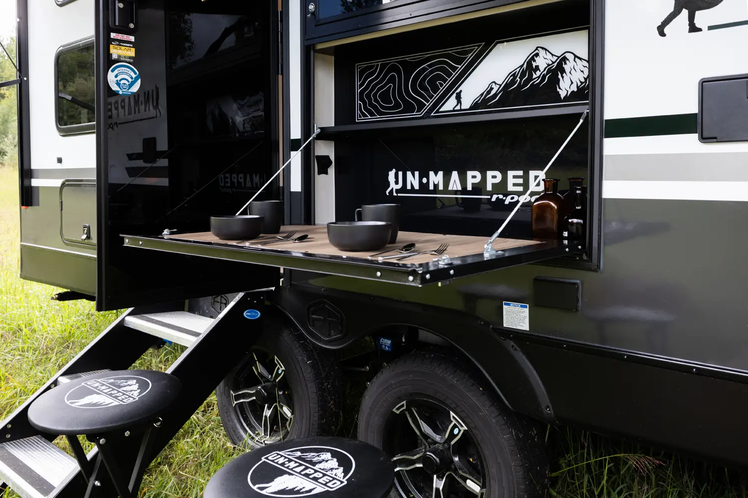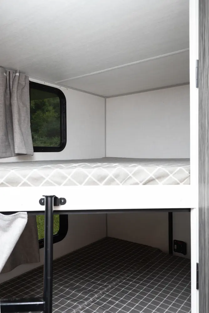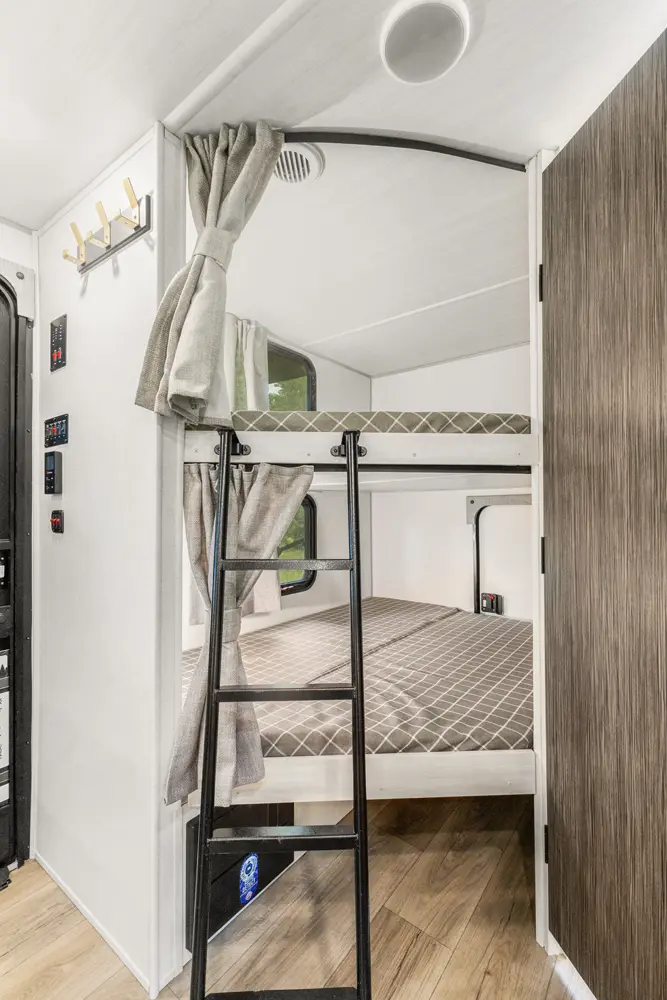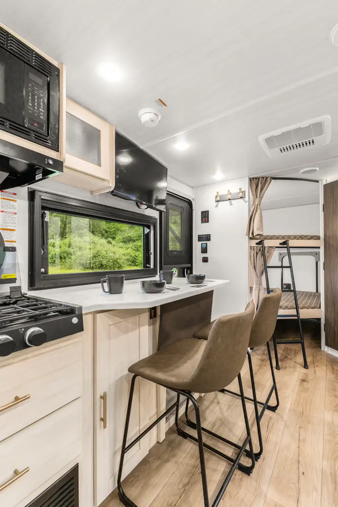The Un•Mapped 26BH features a rear bunkhouse with double-over-double bunks, accommodating up to four sleepers. The kitchen is equipped with a 12V black glass refrigerator and an air fryer microwave. The Bar2Table pull-out dinette and TrailGate outdoor bar enhance dining flexibility and outdoor entertaining. Inside, enjoy a king bed, 15K A/C, and a tankless on-demand water heater. Exterior amenities include a 21' powered awning and a hot & cold spray port, perfect for compact adventures.