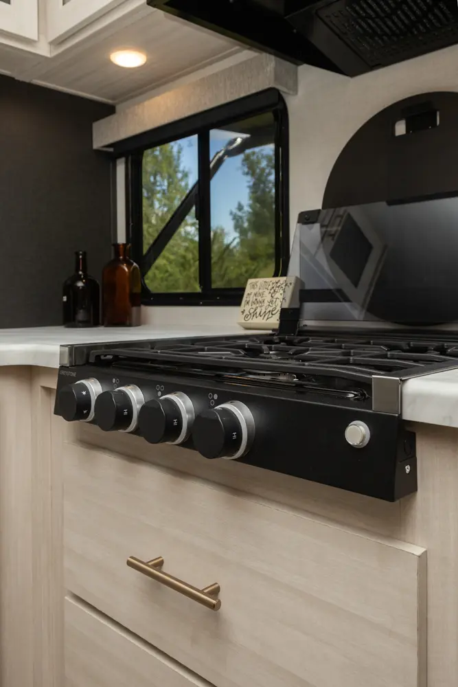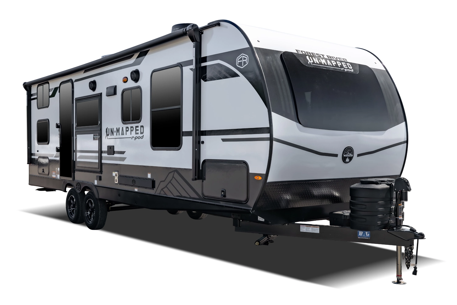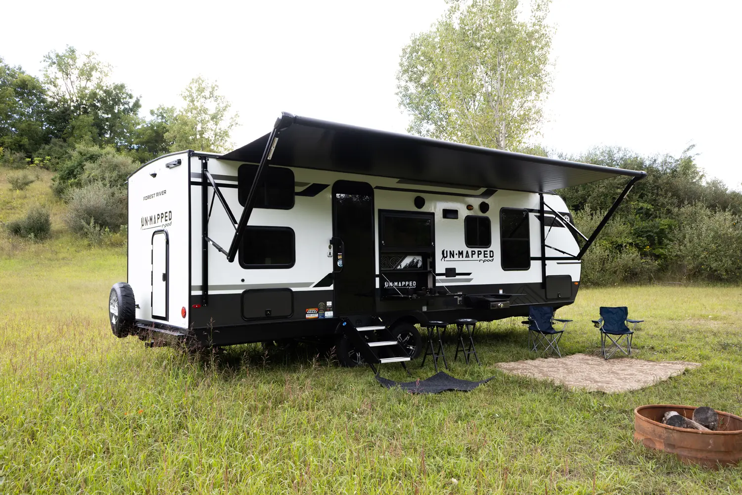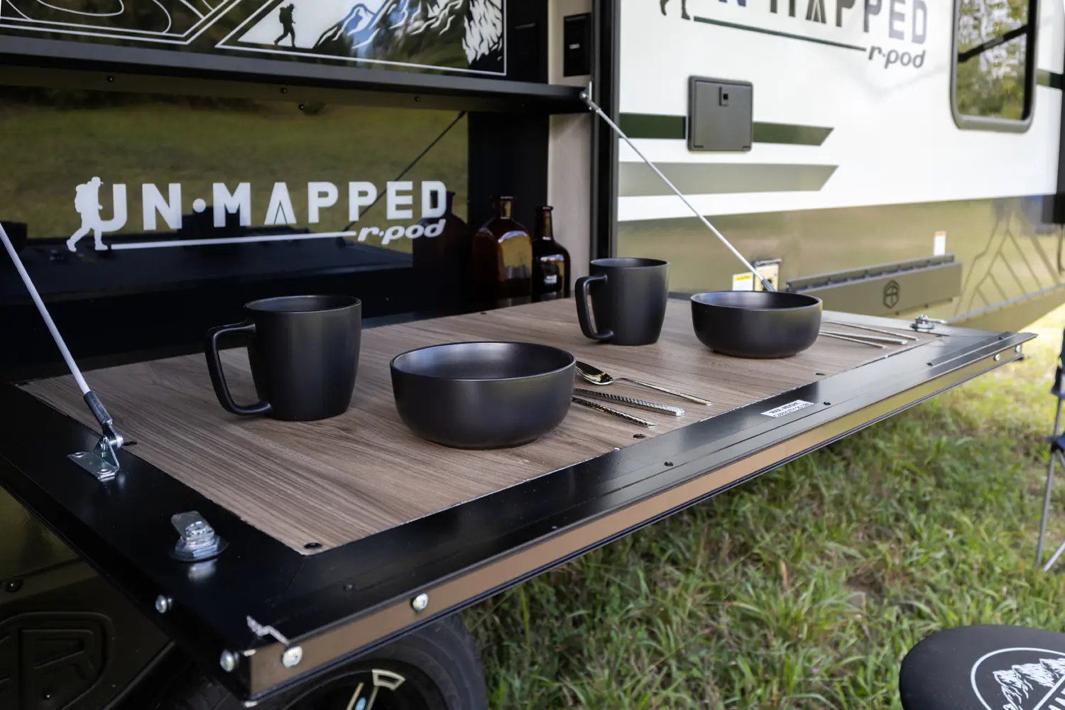 The Un•Mapped 26BH features a rear bunkhouse with double-over-double bunks, accommodating up to four sleepers. The kitchen is equipped with a 12V black glass refrigerator and an air fryer microwave. The Bar2Table pull-out dinette and TrailGate outdoor bar enhance dining flexibility and outdoor entertaining. Inside, enjoy a king bed, 15K A/C, and a tankless on-demand water heater. Exterior amenities include a 21' powered awning and a hot & cold spray port, perfect for compact adventures.