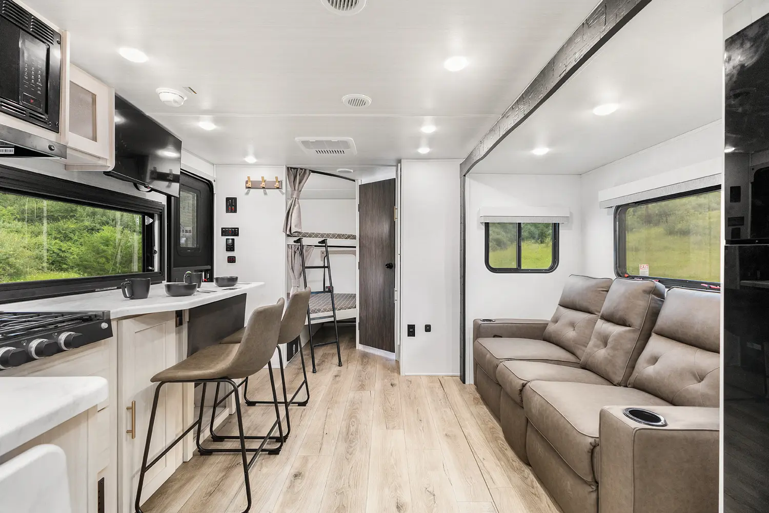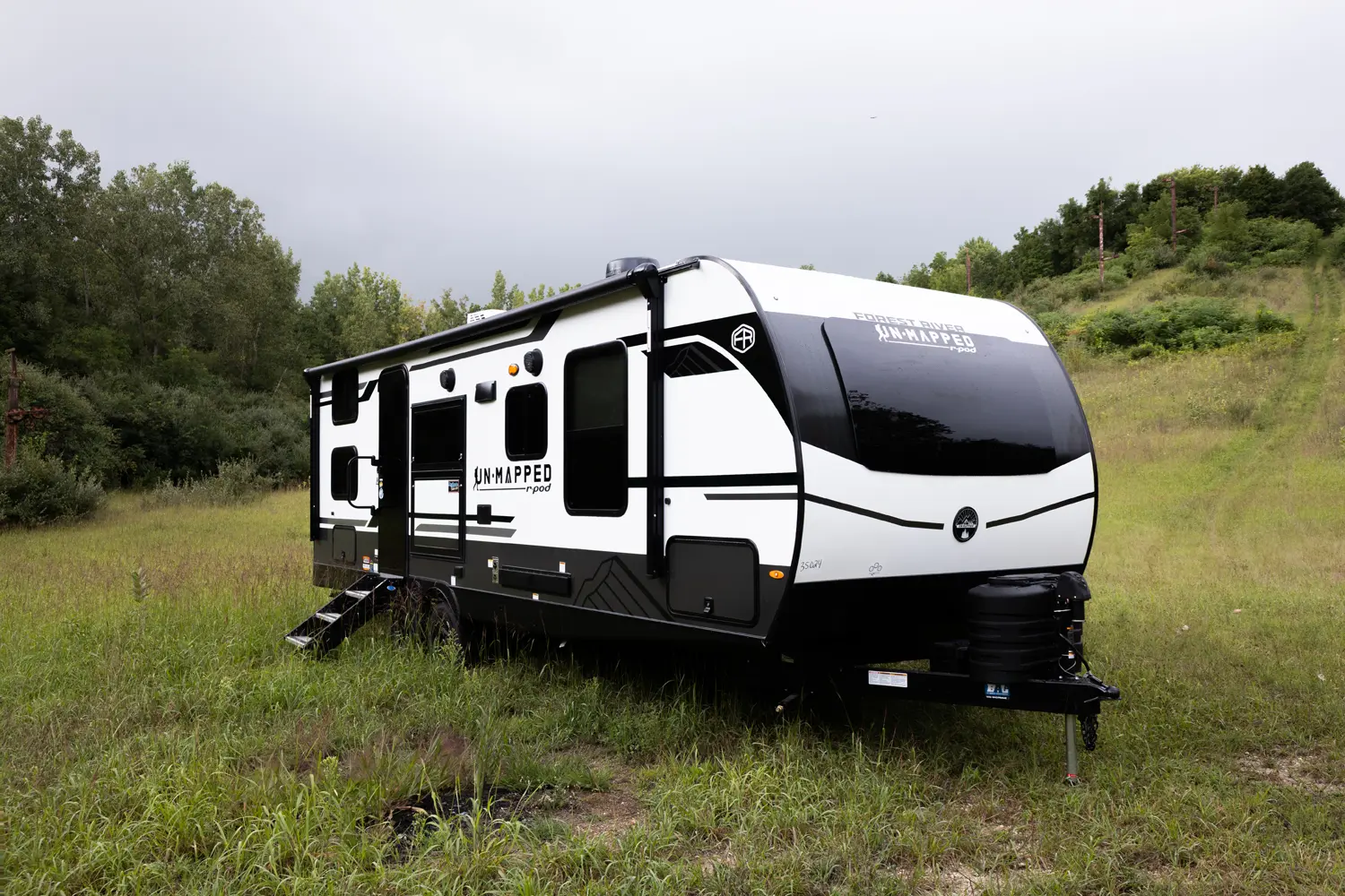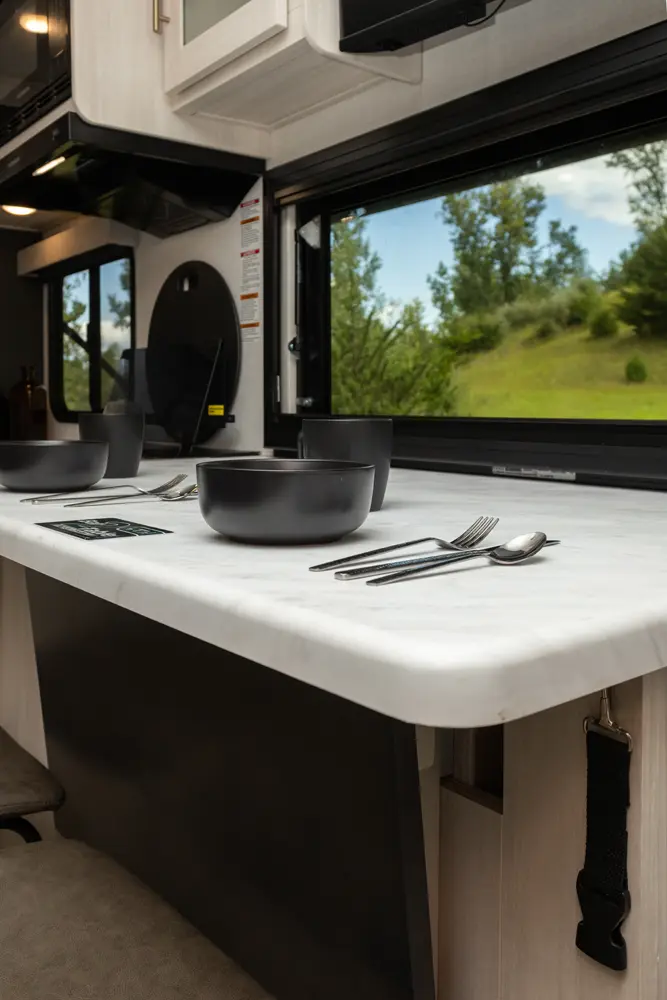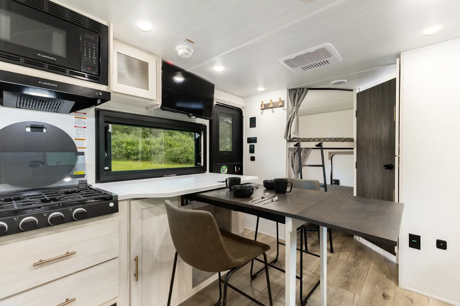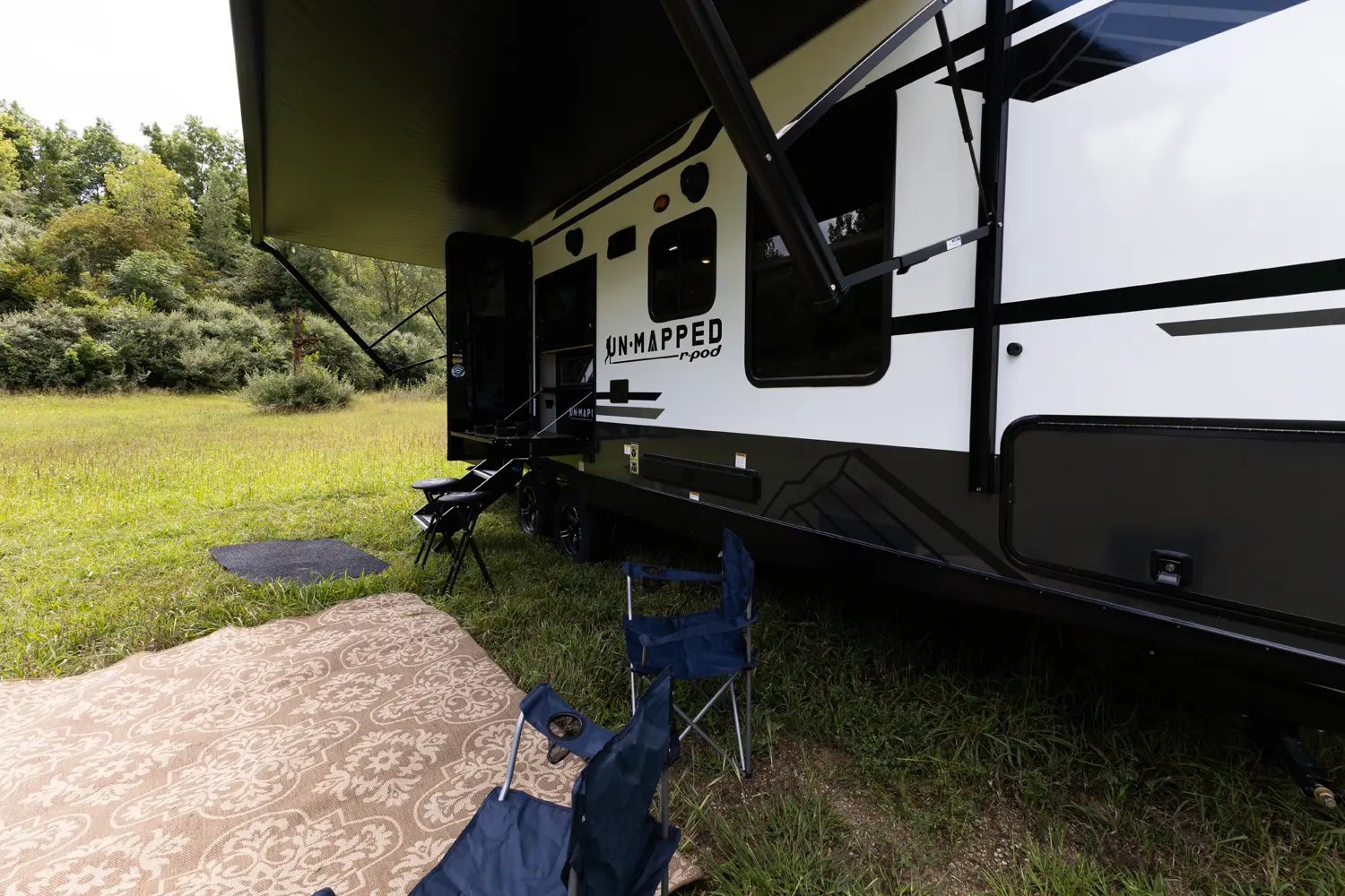 The Un•Mapped 26BH features a rear bunkhouse with double-over-double bunks, accommodating up to four sleepers. The kitchen is equipped with a 12V black glass refrigerator and an air fryer microwave. The Bar2Table pull-out dinette and TrailGate outdoor bar enhance dining flexibility and outdoor entertaining. Inside, enjoy a king bed, 15K A/C, and a tankless on-demand water heater. Exterior amenities include a 21' powered awning and a hot & cold spray port, perfect for compact adventures.