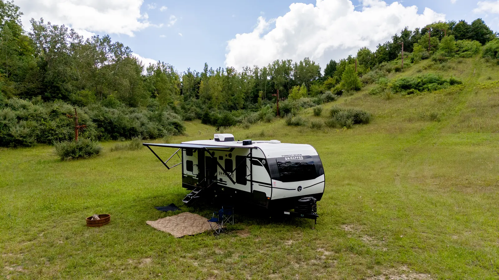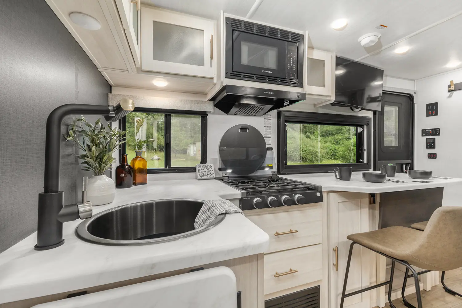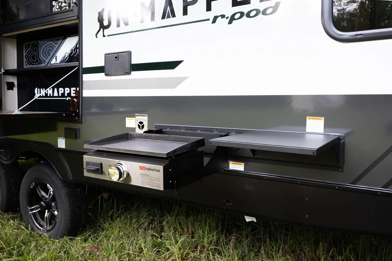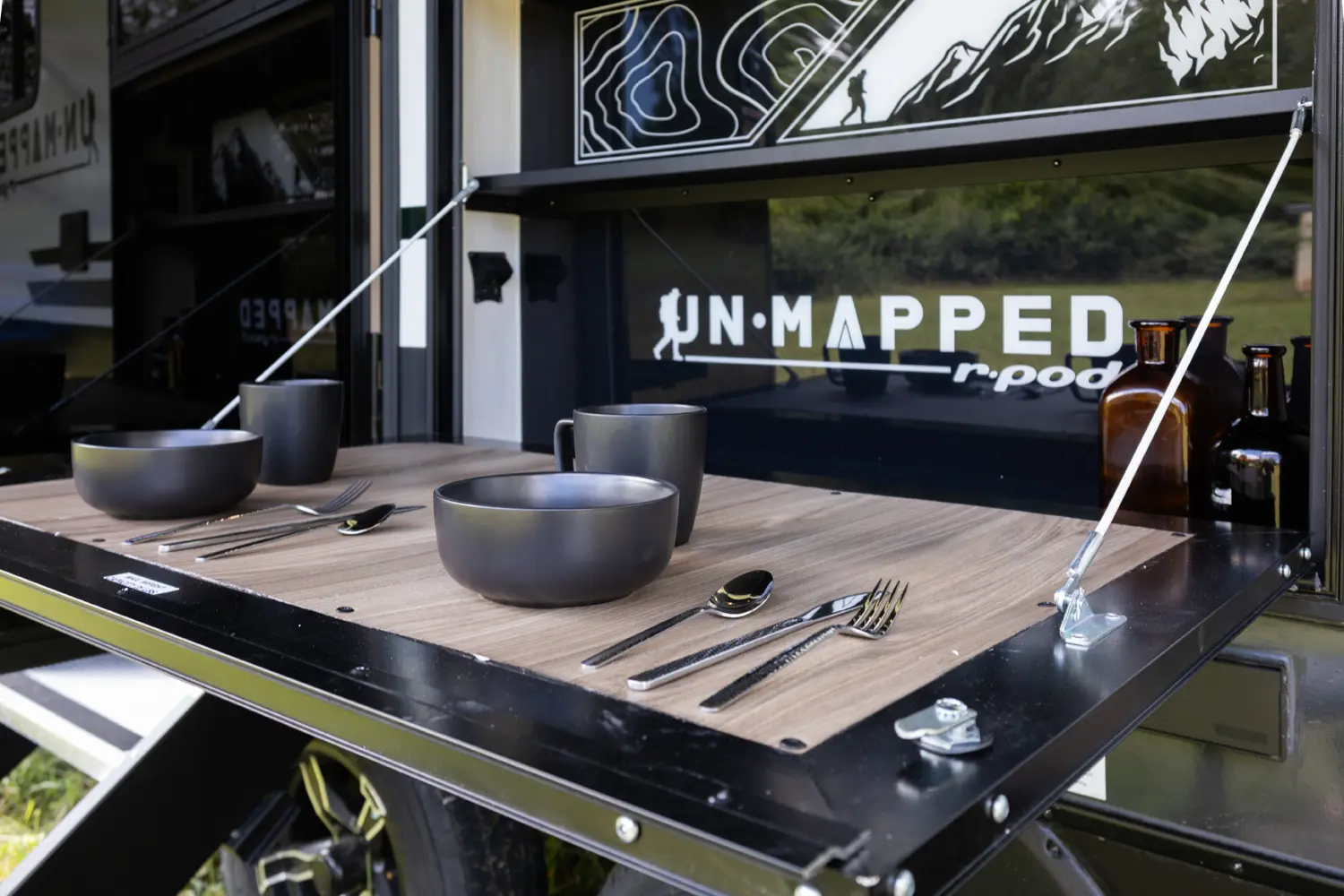 The Un•Mapped 26BH features a rear bunkhouse with double-over-double bunks, accommodating up to four sleepers. The kitchen is equipped with a 12V black glass refrigerator and an air fryer microwave. The Bar2Table pull-out dinette and TrailGate outdoor bar enhance dining flexibility and outdoor entertaining. Inside, enjoy a king bed, 15K A/C, and a tankless on-demand water heater. Exterior amenities include a 21' powered awning and a hot & cold spray port, perfect for compact adventures.